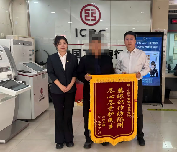 看着账户内安稳留存的资金,回想起差点儿被诈骗分子划走的惊险历程,客户王先生感慨万分,特意将一面写有“慧眼识诈防陷阱 尽心尽责护民生”的锦旗送到神木支行,握着工作人员的手反复说:“多亏工行反应快、服务实,帮我躲过了这一劫!实在是太感谢你们了!”