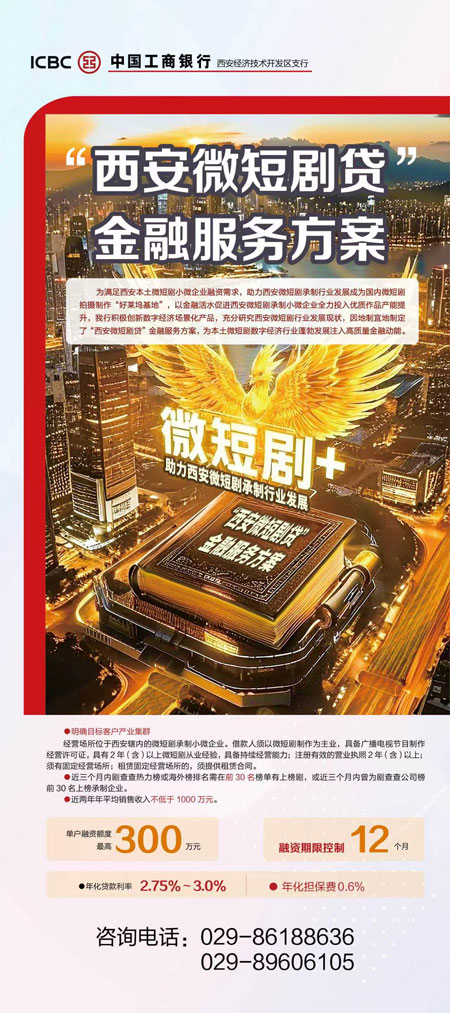 近日,工商银行西安经济技术开发区支行成功向其发放了300万元贷款,该笔业务源自创新数字经济场景化金融产品“西安微短剧贷”。该产品的成功落地,标志着金融机构在支持轻资产、高成长性的文化创意产业方面取得了模式性突破。同时,此举为西安本土微短剧这一数字经济新兴赛道注入了金融动能,是“金融+产业”深度融合的一次区域性实践。