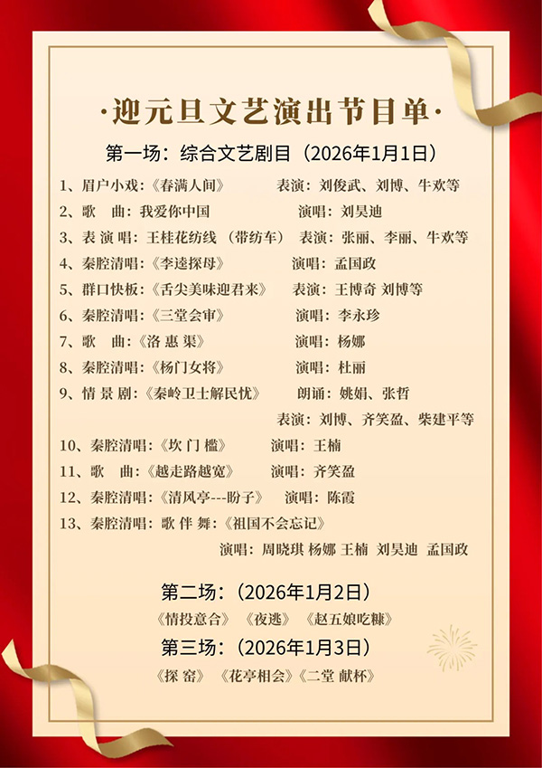 2026年1月1日-3日,洛南县剧团每日13:00--15:00将在惠民广场为观众带来专场演出,悠扬的唱腔、精彩的表演,将让您在购物和享受美食的同时,领略一场精彩纷呈的文化盛宴,感受传统文化的魅力和浓浓的节日氛围。