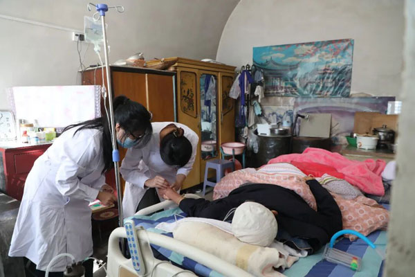 鱼河峁镇卫生院“家庭病床”团队正为农村患者提供上门输液服务