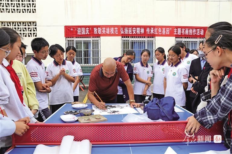 9月26日,汉中市南郑区延安精神研究会联合区教体局举办“迎国庆”主题书画创作活动。书画名家与师生代表以笔墨表达对英雄模范的敬意与对祖国的祝福。通讯员 何祥弘摄