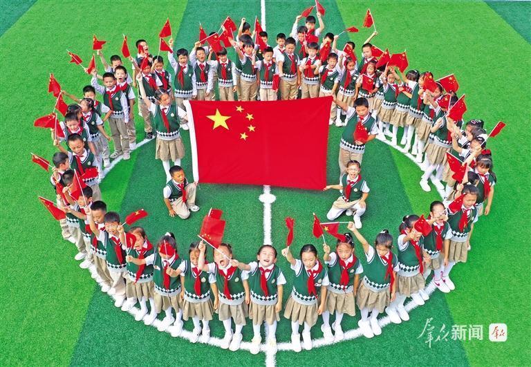 9月30日,渭南市临渭区渭南小学开展“我和国旗合张影”主题活动。学生们通过高唱爱国歌曲、学习国旗知识、向国旗敬礼以及与国旗合影等形式,表达对伟大祖国的美好祝愿,喜迎国庆佳节。图为渭南小学操场上,学生们与国旗合影。 通讯员 崔正博摄