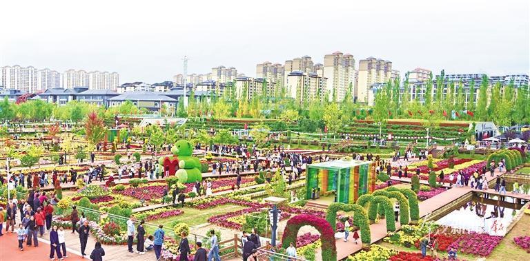 10月2日,延安新区人民公园金秋菊展吸引众多游客前来观赏。 通讯员 王德荣摄