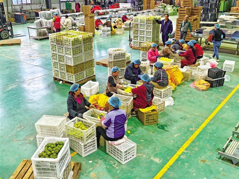 10月10日,在全国最大规模猕猴桃开采仪式现场,工人将新鲜采摘的猕猴桃装箱。 记者 田若楠摄