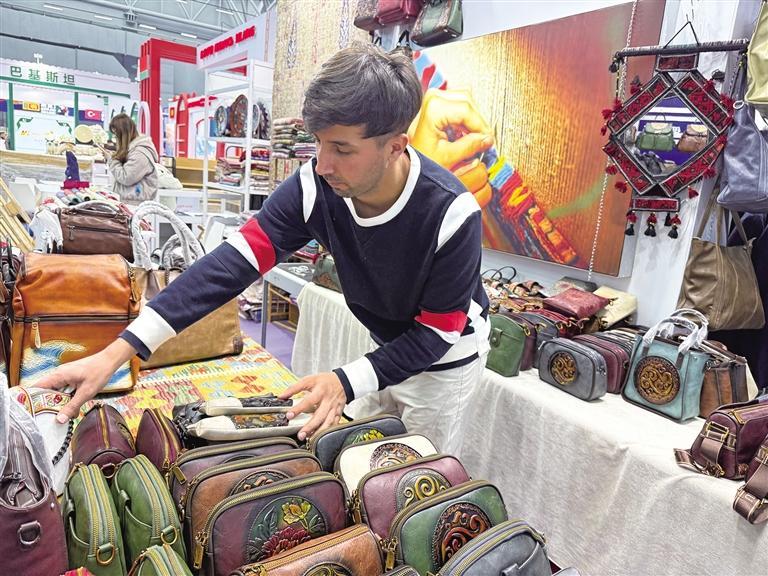 来自阿富汗的参展商阿尼夫在摆放展品,这是他第三次参加杨凌农高会。“你看这些皮包,都是今年的新品,采用全牛皮材质,价格很亲民。”阿尼夫笑着介绍,“今年我带来了1000多件产品,包括皮包、珠宝、皮草等,这些品类往年在农高会上都卖得很好。今年最大的感受就是场馆条件更好了,我们的展位面积也比以前更大,特别期待今年的参展成果。”