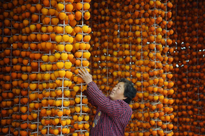 陕西省富平县曹村镇太白村村民在晾晒柿子。新华社记者 刘潇 摄