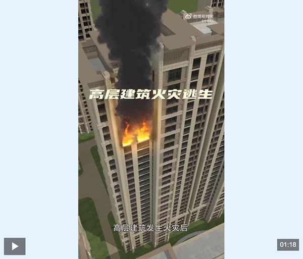 蔓延快:高层建筑火灾荷载大,各类管道竖井多,从火灾调查的实际情况看,往往3分钟左右,烟气就能充满整个空间。