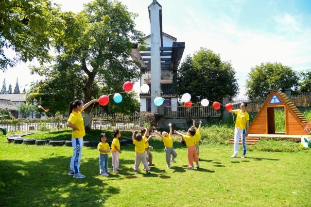 9月5日,四川泸州白酒产业园区天骄托育园的老师带领孩子们做游戏。新华社记者江宏景摄
