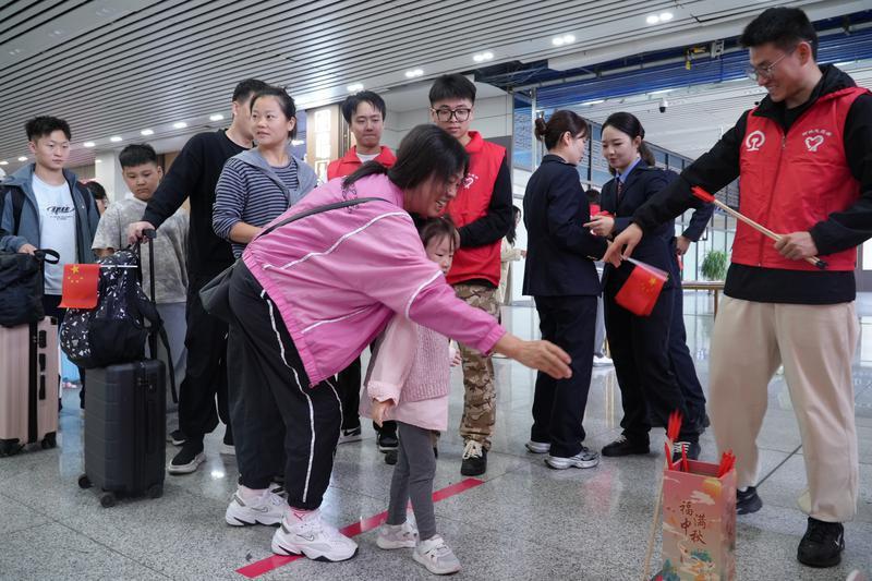 西安车务段、汉中车务段在管内各客运站精心组织开展“与国旗同框,为祖国祝福”主题活动,组织车站工作人员为候车旅客分发小国旗,让候车室变成了传递家国情怀的温暖空间。安康车务段万源车站以“月圆旅途·家国同庆”为主题,在候车大厅开展歌舞、魔术表演和猜灯谜等丰富的趣味活动,引得旅客纷纷鼓掌喝彩,为南来北往的旅客送上别样的旅途温暖。