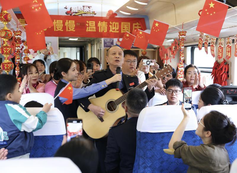 此外,为给旅客旅途增添节日氛围,西安客运段在6064次公益慢火车、G828次西安北开往香港西九龙的列车上举行歌曲、舞蹈、小品等系列文艺活动,与广大旅客共同庆祝祖国生日和传统佳节,传播中华优秀传统文化,工作人员还邀请旅客参与互动,手把手教大家正确的行李摆放方式、乘车安全注意事项,不少旅客表示:“原来乘车还有这么多小知识,这样的展示既实用又贴心。”宝鸡东站在宝鸡南站候车大厅精心举办“月满华诞 情暖旅途”主题文化活动,旅客既能在国庆主题打卡区拍摄纪念照,也能欣赏车站职工带来的国庆主题文化表演,为广大旅客营造了欢乐祥和的节日氛围。