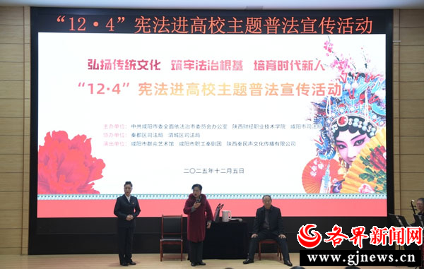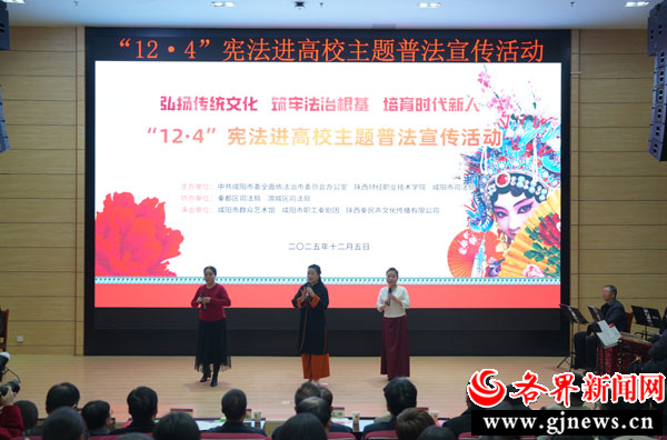 各界新闻网讯 12月5日,在第十二个国家宪法日到来之际,一场以“弘扬传统文化 筑牢法治根基 培育时代新人”为主题的“12·4”宪法进高校主题普法宣传活动在陕西财经职业技术学院举行。本次活动由中共咸阳市委全面依法治市委员会办公室、陕西财经职业技术学院、咸阳市司法局联合主办,秦都区司法局、渭城区司法局协办,咸阳市群众艺术馆、咸阳市职工秦剧团、陕西秦民声文化传播有限公司作为演出单位参与活动,旨在通过生动活泼的形式,将宪法精神与法治观念深植青年学子心中。
