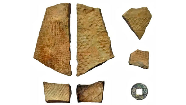 考古调查发现的陶瓦片、五铢钱等