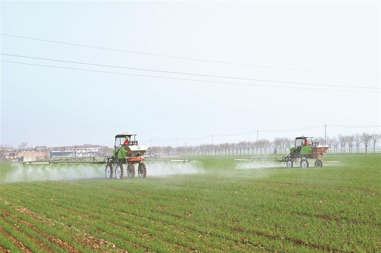 据介绍,春节一收假,合作社就陆续开始春季麦田化除作业,目前用了2台自走式喷杆喷雾机、10架植保无人机,开展全方位精准化除。“截至目前,合作社已经完成5000多亩地的化除作业,后续会持续发力,力争在3月19日前完成全部作业,不耽误农时。”闫国鹏说。