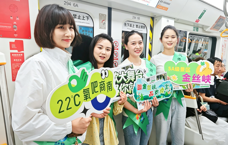 随后,活动转场至西安地铁9号线,一场别开生面的文旅快闪活动精彩上演。车厢外,工作人员身着统一服装、佩戴主题绶带,手持创意手举牌和宣传条幅,热情邀请乘客合影互动。车厢内,商南文旅工作人员以生动有趣的方式介绍了商南文旅资源和亮点。