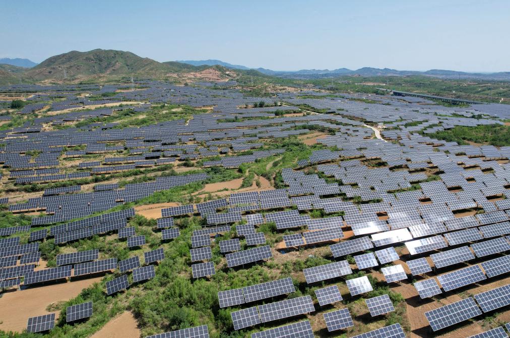 2025年6月16日拍摄的河北省赞皇县许亭镇北潘村附近的“农光互补”光伏发电场(无人机照片)。新华社记者杨世尧摄