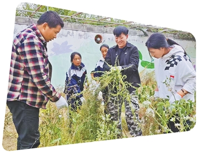 师范生杨鹏鑫(右二)带领学生在劳动课上除草。