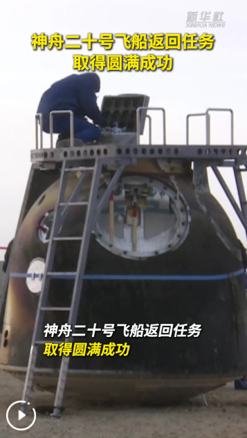 当日9时34分,神舟二十号飞船返回舱在东风着陆场成功着陆。经现场检查确认,飞船返回舱外观总体正常,舱内下行物品状态良好,神舟二十号飞船返回任务取得圆满成功。