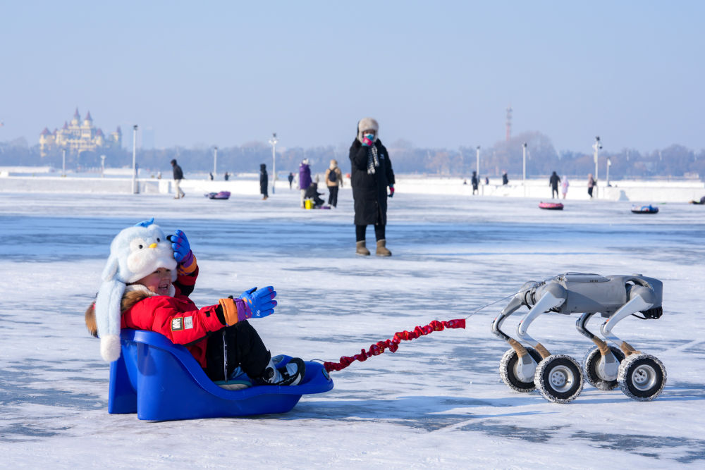 1月11日,小朋友在松花江哈尔滨段江面上体验机器狗拉爬犁。新华社记者 王建威 摄