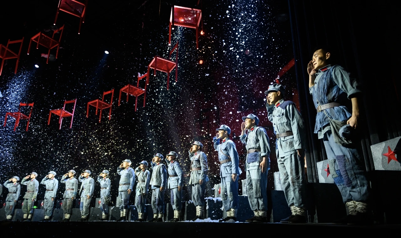 《再回延安》打破传统观演模式,以“策划先行、定制剧场”的创新理念,打造超4500㎡的动态观演空间,一次可容纳500人同步体验65分钟的沉浸式旅程。剧场内不设坐席,观众跟随剧情移步换景,在“人随剧走、剧在人中”的行进式观演中,实现“观、听、闻、触”的全感官沉浸。声光电技术与真实风雪特效交织,模拟出刺骨寒风、茫茫草地的真实体感;近万根麦穗组成的金色麦田、242平米可升降的巨型红旗,带来震撼心灵的视觉冲击;演员与观众零距离互动,让每个人都从“旁观者”变为“亲历者”,真切感受长征精神的磅礴力量。