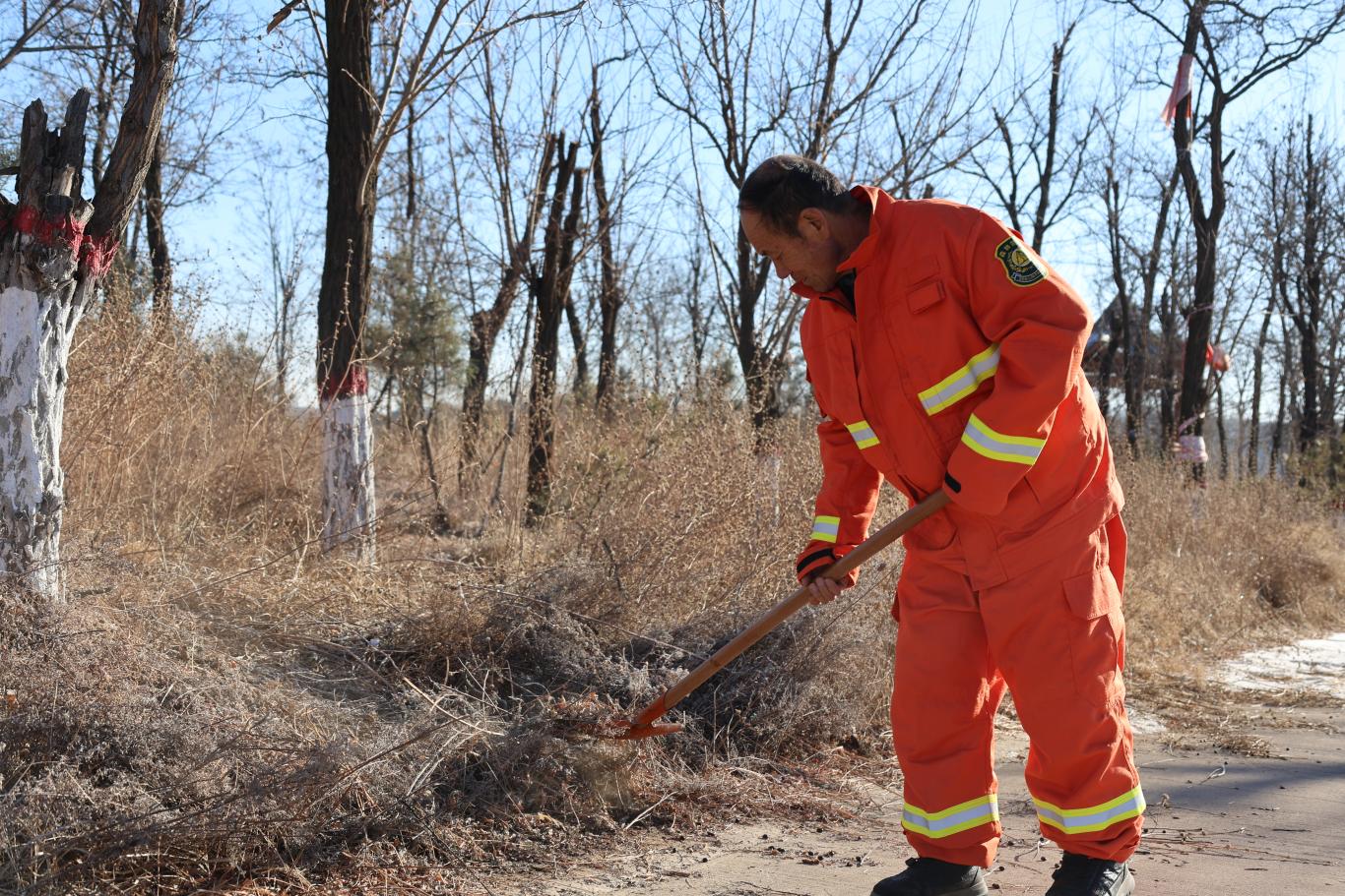 1月19日上午9点,神木市水磨河林场大庄林区内,一抹亮眼的橘红格外醒目——护林员訾兰虎身着巡护服,踏上熟悉的巡山之路。他手握铁锹,走走停停,细心清理着路边和树干上的杂草与枯枝,仔细排查火情隐患。“我们每天都要巡山,冬季天干物燥,我们的首要任务就是防火,每天能走十几二十公里的路。”訾兰虎说。