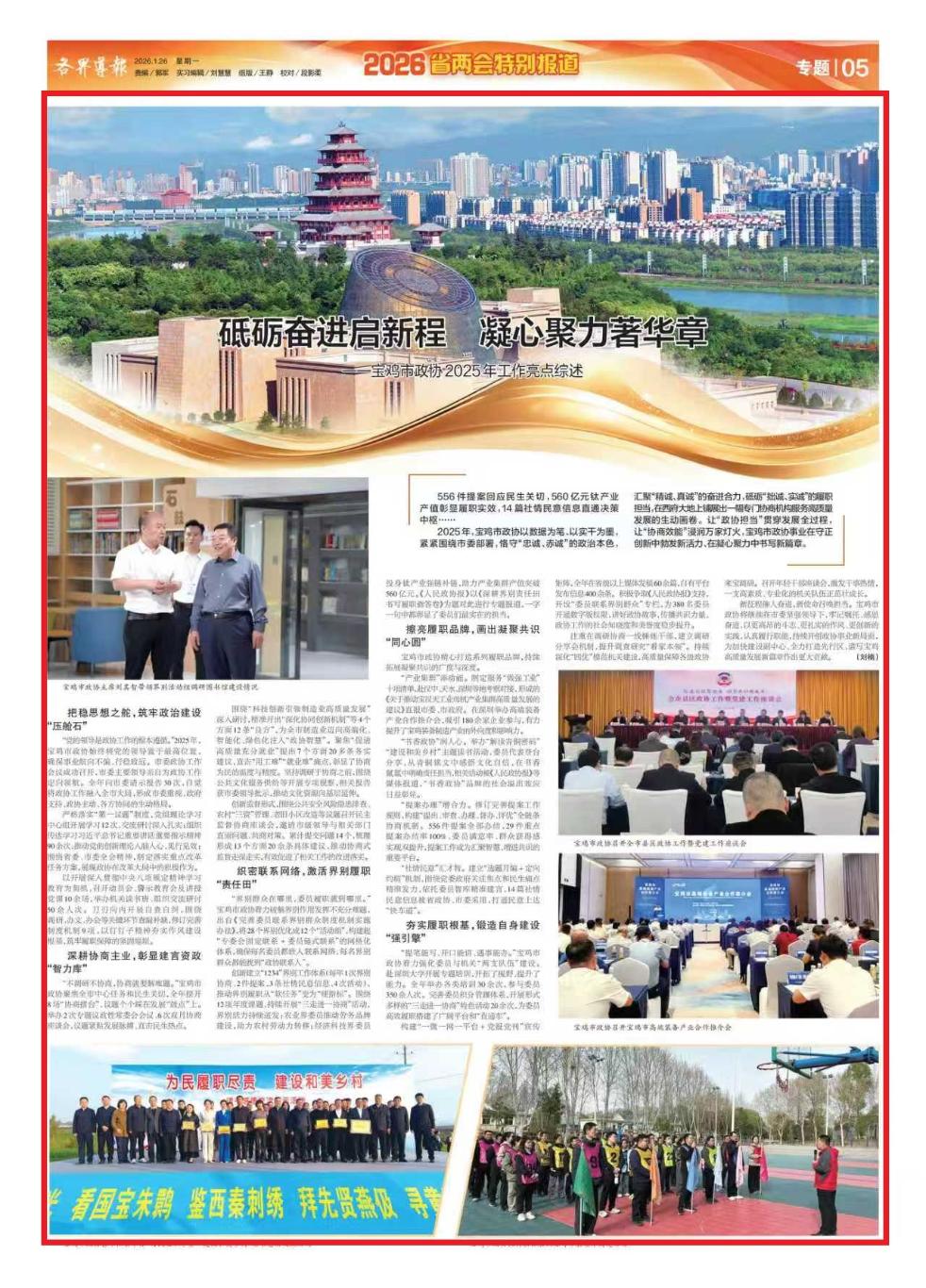 2025年,宝鸡市政协以数据为笔、以实干为墨,紧紧围绕市委部署,恪守“忠诚、赤诚”的政治本色,汇聚“精诚、真诚”的奋进合力,砥砺“拙诚、实诚”的履职担当,在西府大地上铺展出一幅专门协商机构服务高质量发展的生动画卷。让“政协担当”贯穿发展全过程,让“协商效能”浸润万家灯火,宝鸡市政协事业在守正创新中勃发新活力、在凝心聚力中书写新篇章。