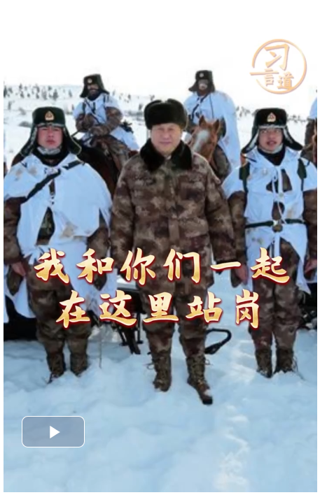 “我和你们一起在这里站岗。”2014年1月26日,习近平主席来到内蒙古阿尔山,冒着零下30多摄氏度的严寒,迎风踏雪慰问在边防线上巡逻执勤的官兵。统帅与士兵心连心,一步一履总关情。士兵,始终是习近平主席心头的牵挂。