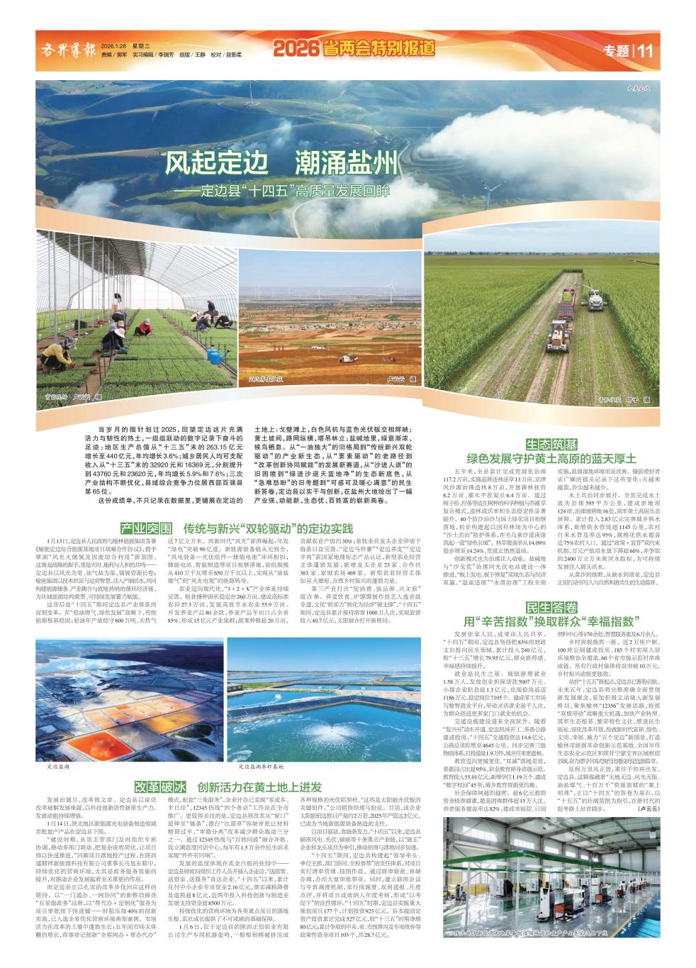 这份成绩单,不只记录在数据里,更铺展在定边的土地上:戈壁滩上,白色风机与蓝色光伏板交相辉映;黄土坡间,路网纵横、塔吊林立;盐碱地里,绿意渐浓、候鸟栖息。从“一油独大”的旧格局到“传统新兴双轮驱动”的产业新生态,从“要素驱动”的老路径到“改革创新协同赋能”的发展新赛道,从“沙进人退”的旧困境到“绿进沙退天蓝地净”的生态新底色,从“急难愁盼”的旧考题到“可感可及暖心满意”的民生新答卷,定边县以实干与创新,在盐州大地绘出了一幅产业强、动能新、生态优、百姓富的崭新画卷。