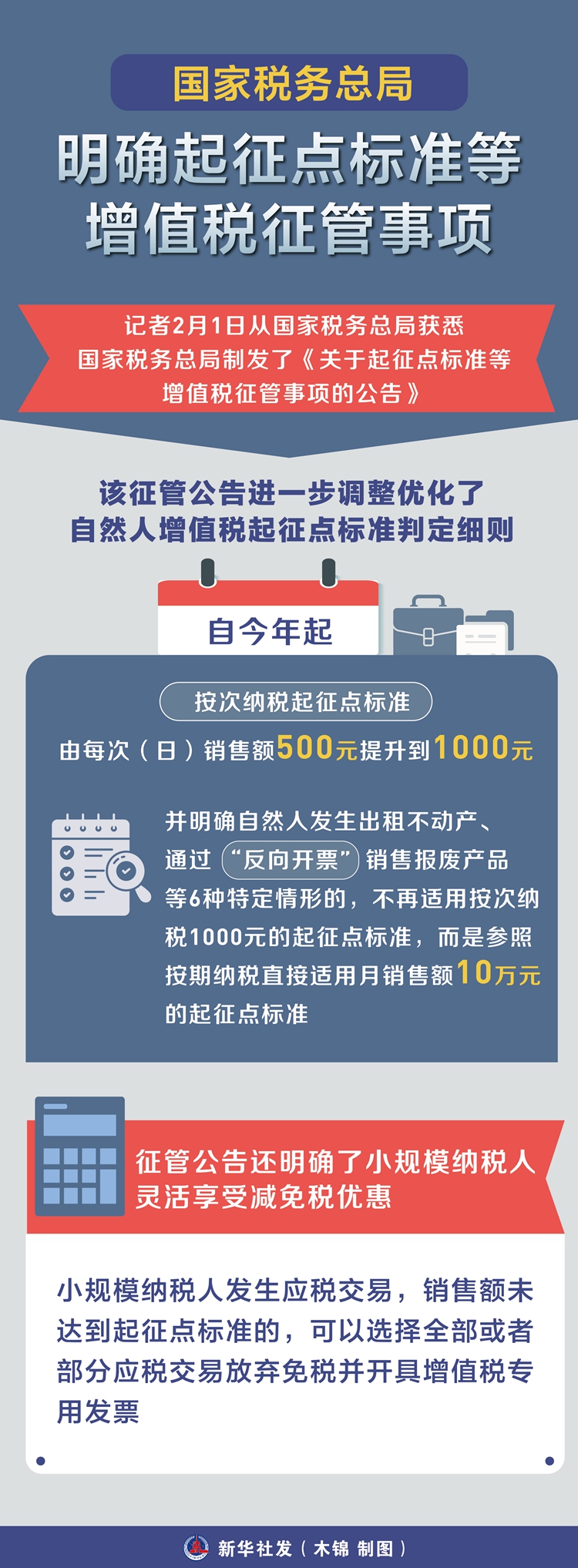 新华社北京2月1日电(记者刘开雄)记者2月1日从国家税务总局获悉,国家税务总局制发了《关于起征点标准等增值税征管事项的公告》,就起征点标准判定、税收优惠政策适用等增值税征管事项作了进一步明确,细化操作要求,推动增值税法及其实施条例落实落地。