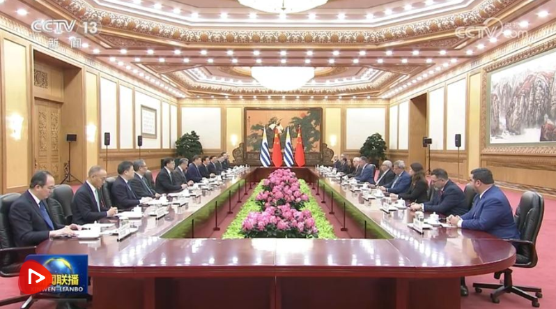 习近平指出,当今世界正处于百年未有之大变局,国际形势变乱交织,单边霸凌愈演愈烈,中方支持乌拉圭接任“77国集团和中国”轮值主席国,愿与乌方加强全球南方团结协作,共同推进平等有序的世界多极化、普惠包容的经济全球化,携手并进、共谋发展,为构建人类命运共同体作出更大贡献。中方始终重视中拉关系,支持拉美和加勒比国家维护自身主权、安全、发展利益,支持乌拉圭接任拉美和加勒比国家共同体以及南方共同市场轮值主席国,愿同乌方和地区国家推动共建中拉命运共同体走深走实。