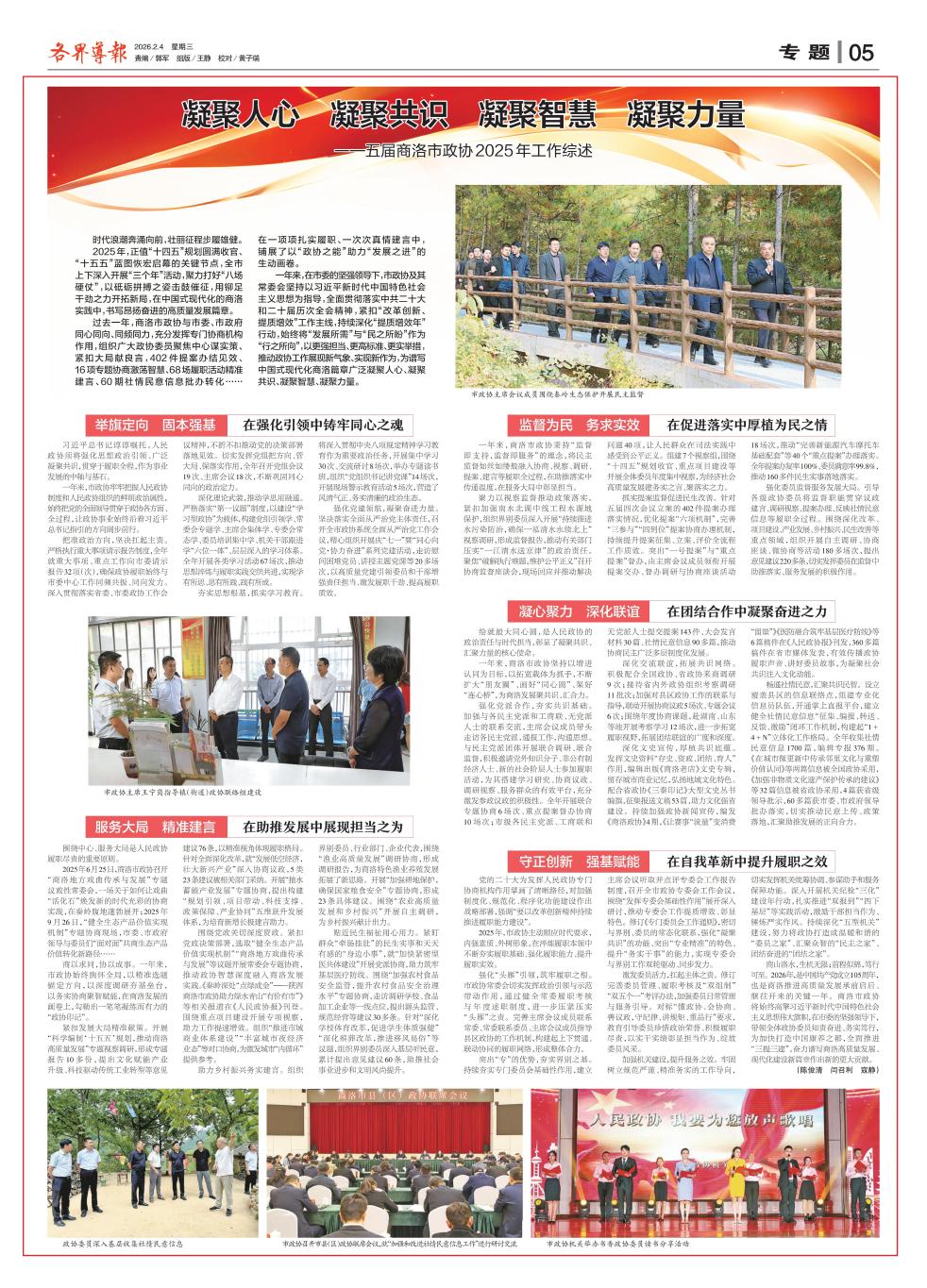 过去一年,商洛市政协与市委、市政府同心同向、同频同力,充分发挥专门协商机构作用,组织广大政协委员聚焦中心谋实策、紧扣大局献良言,402件提案办结见效、16项专题协商激荡智慧、68场履职活动精准建言、60期社情民意信息批办转化……在一项项扎实履职、一次次真情建言中,铺展了以“政协之能”助力“发展之进”的生动画卷。