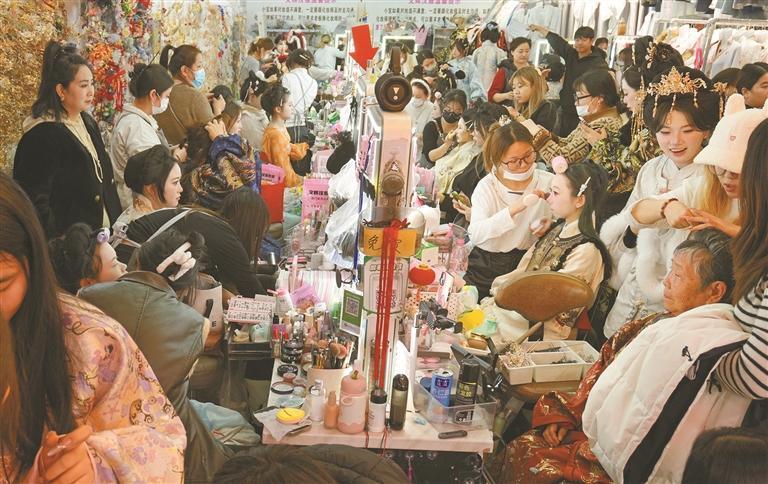 “趁着寒假,我们专程来西安体验汉服妆造。今天,我们想拍些美照,‘预制’过年朋友圈。”范曦文说,此前她常在社交平台刷到西安爆火的汉服体验,十分心动。她们前一晚就选好了喜欢的妆容,今天一大早就来汉服店门口排队了。