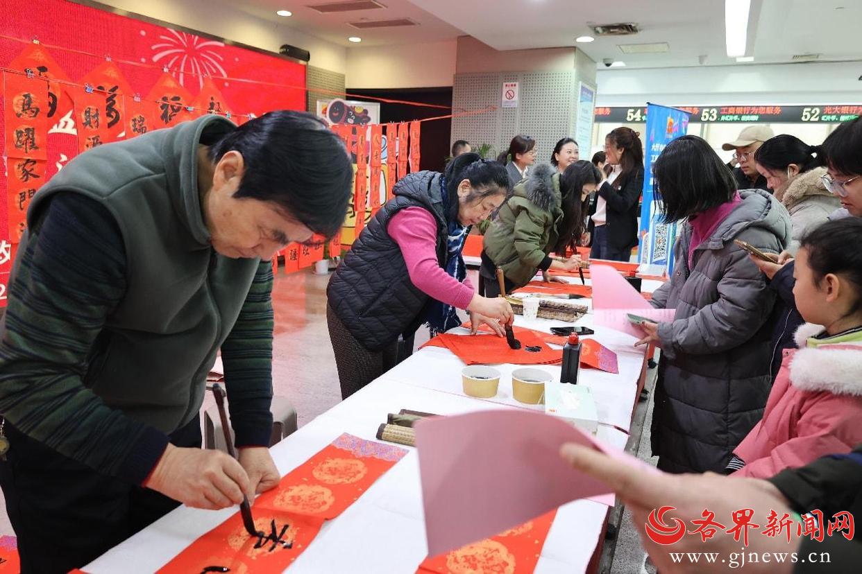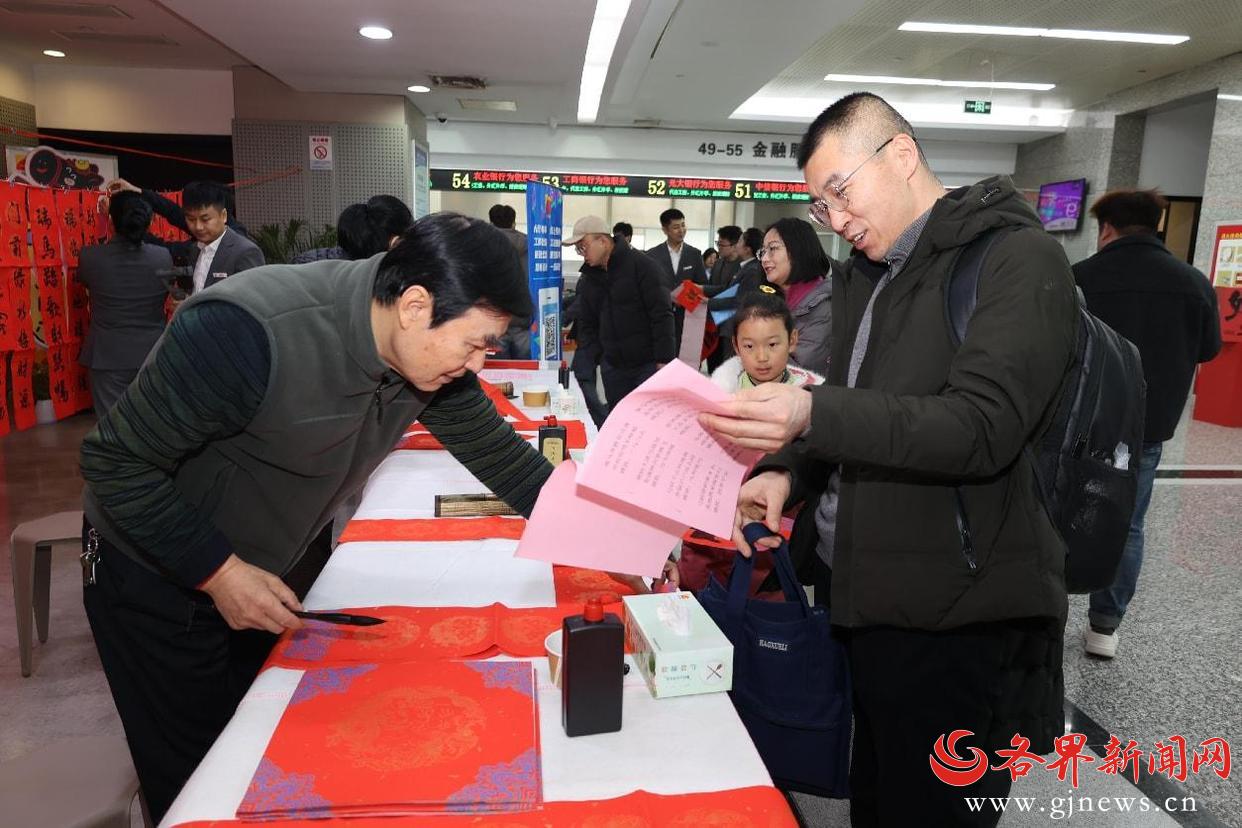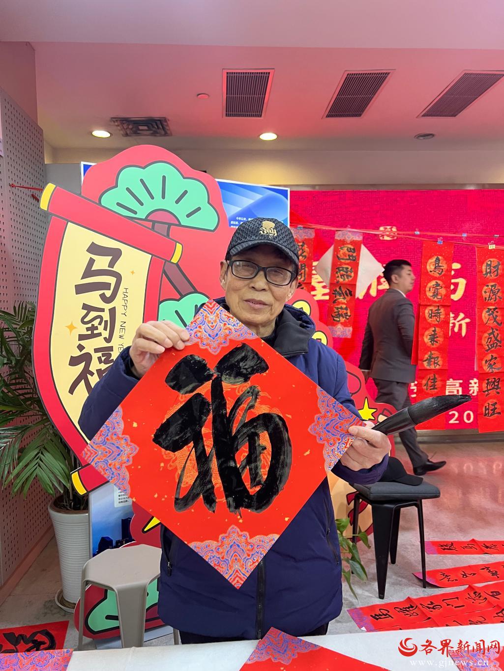 “麻烦帮我写一副‘家兴人顺年年旺,福旺财旺步步高’,家里老人和我都期待能讨个好彩头。”刚办完业务的王先生一边递上提前想好的联句,一边向书法家艺术家说明需求。书法艺术家耐心倾听后,当即挥毫,笔墨间尽显功底,短短几分钟,一副字迹隽秀的春联便新鲜“出炉”。为满足个性化需求,书法家艺术家们不仅接受定制联句,还主动推荐经典吉祥联,让每位参与者均领到心仪的春联和“福”字。