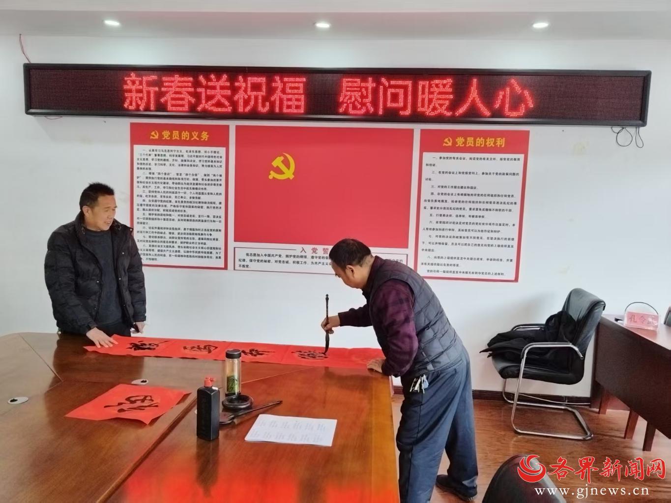 各界新闻网讯(孔令武 祁麟壹)2月4日,正值立春,商南县委统战部、县职教中心到帮扶村开展“新春送祝福·慰问暖人心”活动,驻曹营村工作队张启东、河南科技学院大学生志愿者祁麟壹等书法爱好者现场为群众免费写春联,挥毫泼墨、端茶倒水、牵纸服务,写对联、题福字、书横批,清新墨香、大红春联、志愿服务赢得家乡群众的赞叹和好评。