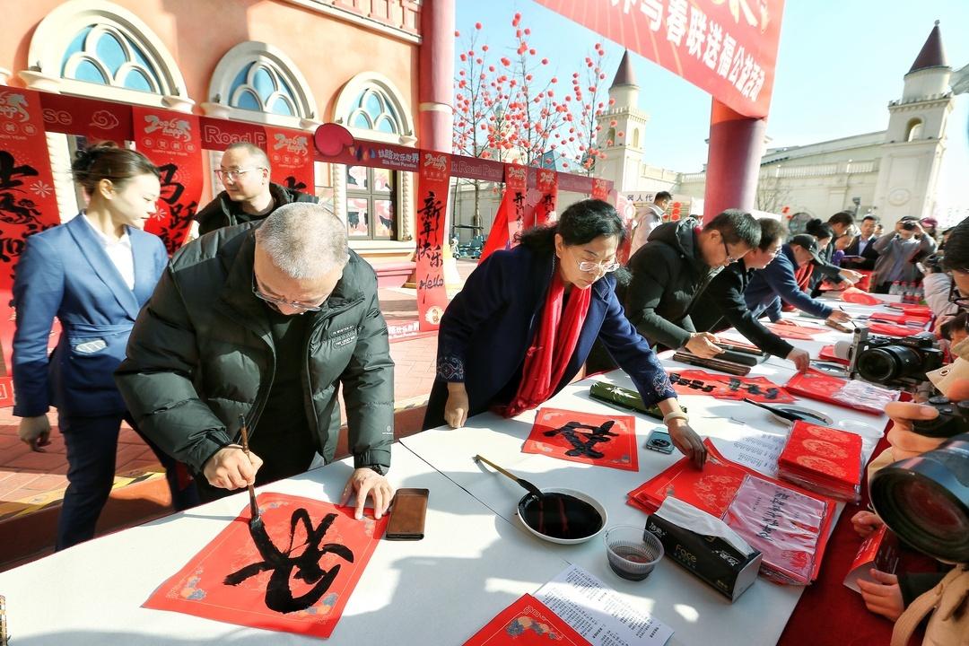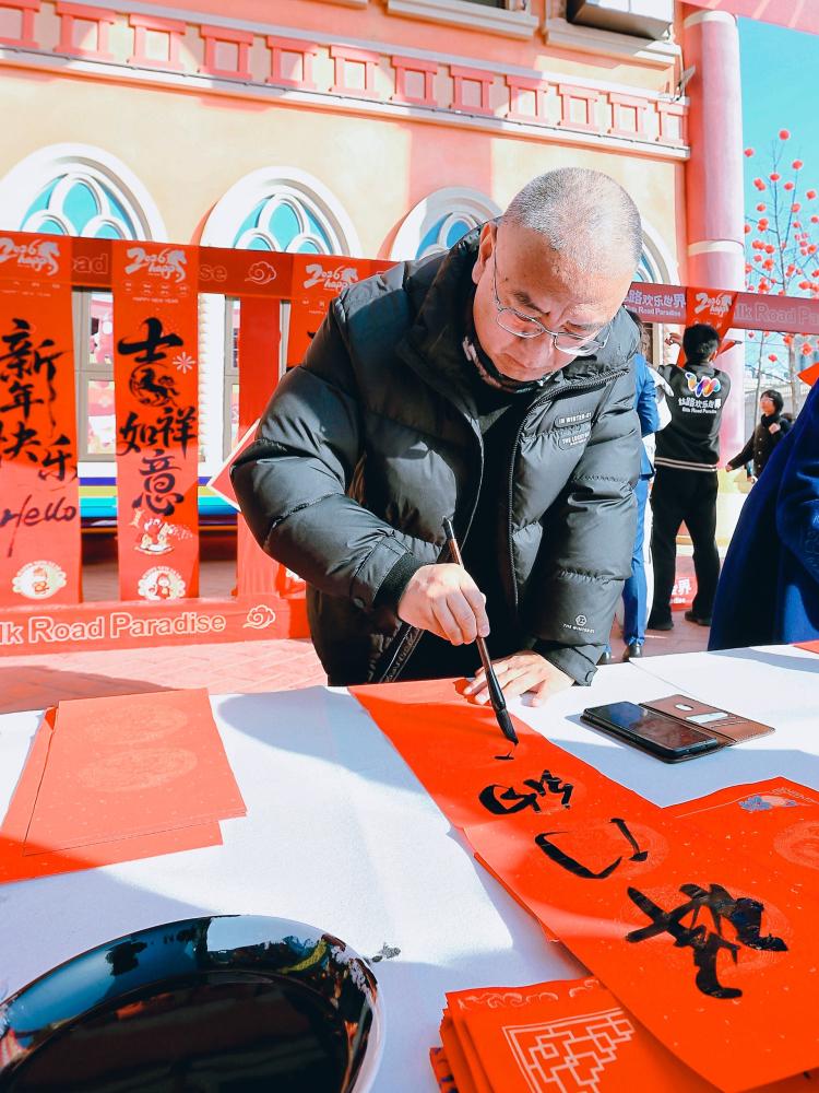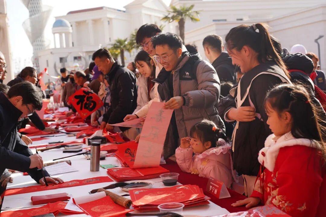 长案铺展,张之、鲁建、金鑫等书法家们展纸蘸墨,笔走龙蛇,一副副寓意吉祥的春联、一个个形态各异的“福”字在笔尖生成,吸引了大量游客驻足欣赏、踊跃领取。