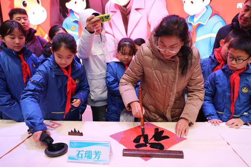 活动中,石主席挥毫题写蕴含多重美好期许的“福”字赠予师生,瞬间点燃了现场的热情。更令人感动的是,市书协的书法家们与铁五小学书法社团的孩子们同台挥毫,共书吉祥。在书法名家的悉心指导下,孩子们一丝不苟地铺纸、运笔,将课堂所学化为笔下真挚的祝福。一副副略显稚嫩却充满真诚的春联和“福”字从孩子们手中诞生,与书法家们的作品相映成趣。
