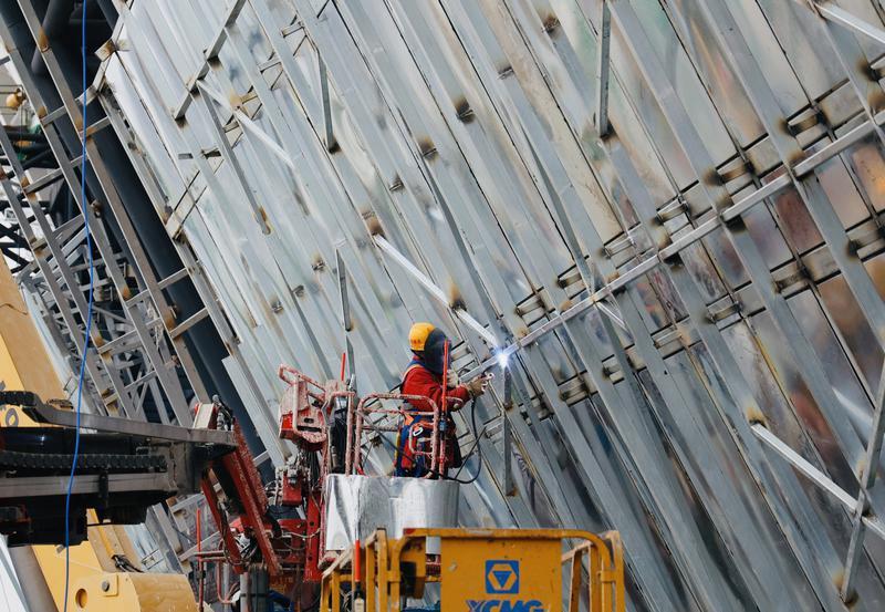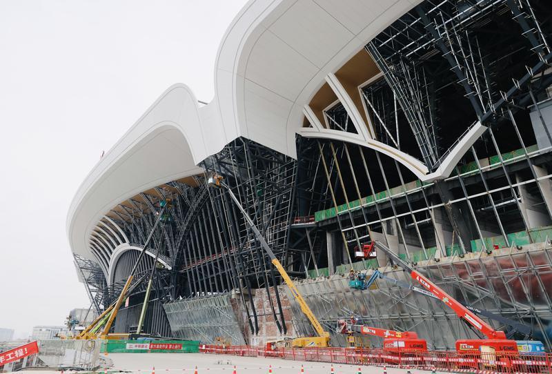 西安东站候车大厅外,工人正加紧进行外立面幕墙施工作业。
