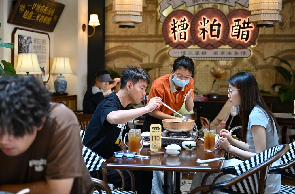 2026年1月29日,游客在文昌铺前三婆糟粕醋店品尝糟粕醋火锅。新华社记者 郭程 摄