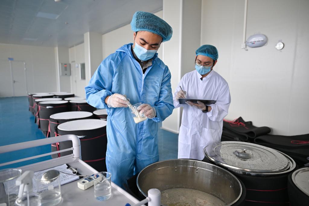 2026年1月28日,海南文昌溪北邦兴食品科技有限公司糟粕醋加工厂的工作人员正在对糟粕醋进行采样检测。新华社记者郭程 摄