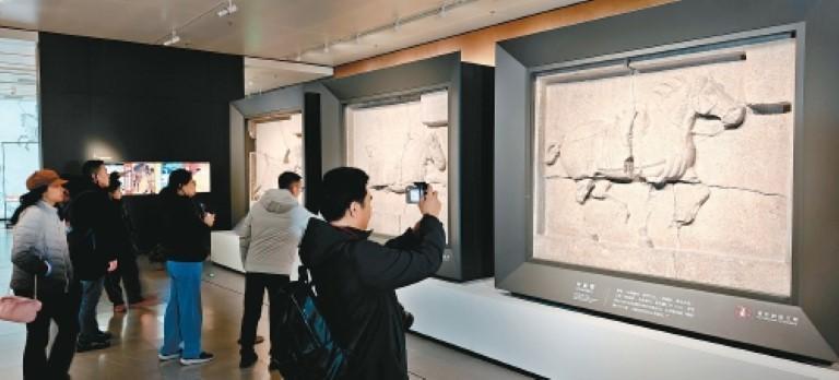 游客在西安碑林博物馆观赏昭陵六骏石刻记者 李明 摄