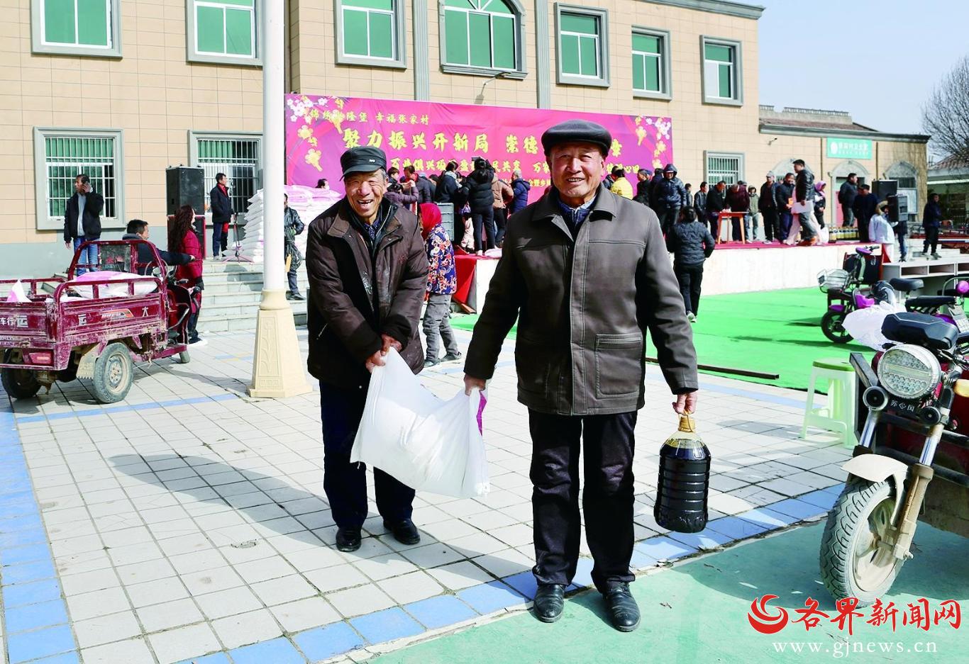 张家村集体经济分红大会结束后,村民将油和面抬回家。