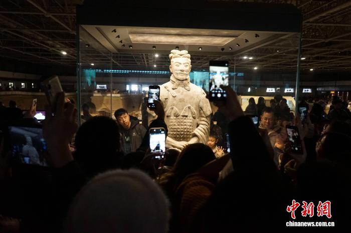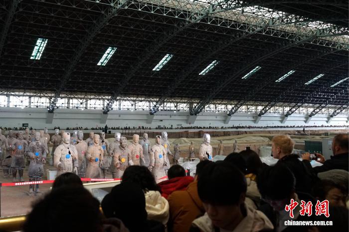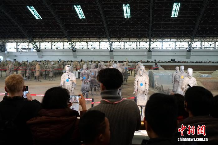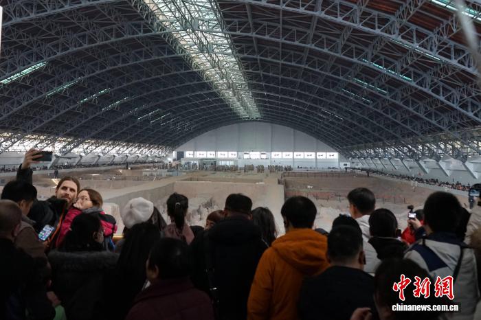 2月12日,陕西西安。临近春节,秦始皇帝陵博物院迎来旅游高峰,来自世界各地的游客走进展厅,参观兵马俑等珍贵文物,沉浸式感受中国古代的历史文化魅力。图为游客参观兵马俑。中新社记者 党田野 摄