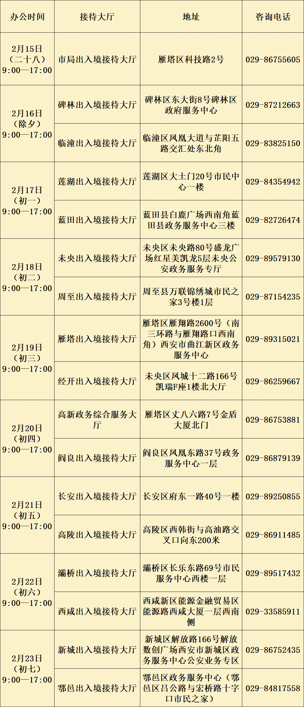 根据《国务院办公厅关于2026年部分节假日安排的通知》,2月15日(星期日)至2月23日(星期一)为2026年春节法定节假日。为满足群众春节期间办证需求,西安市出入境管理支队专门公布了全市出入境接待大厅开放安排表,请市民合理选择时间和地点办理出入境证件(不包括外国人签证相关业务)。