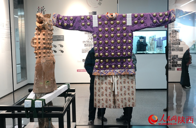 夏寅口中的这件俑,由173块残片粘接修复而成,通体遍布彩绘。一旁展陈的服饰,由秦始皇帝陵博物院与中国丝绸博物馆合作复原——紫色衣料上,缀着黑色八角纹与黄色泡钉,纹饰细腻灵动,生动复刻了秦代宫廷服饰的精致与华贵。