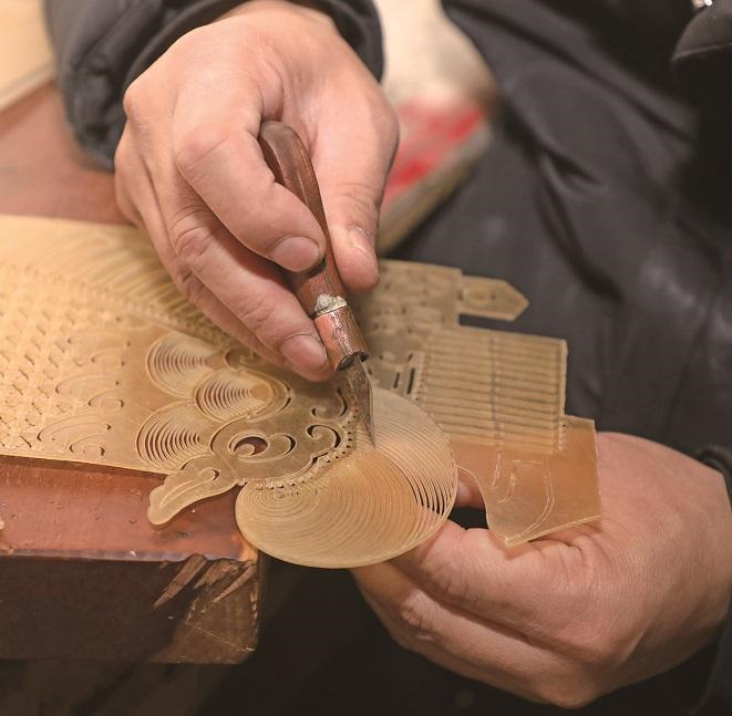 2月6日,张亚峰在雕刻皮影穆桂英。 通讯员 马辛摄