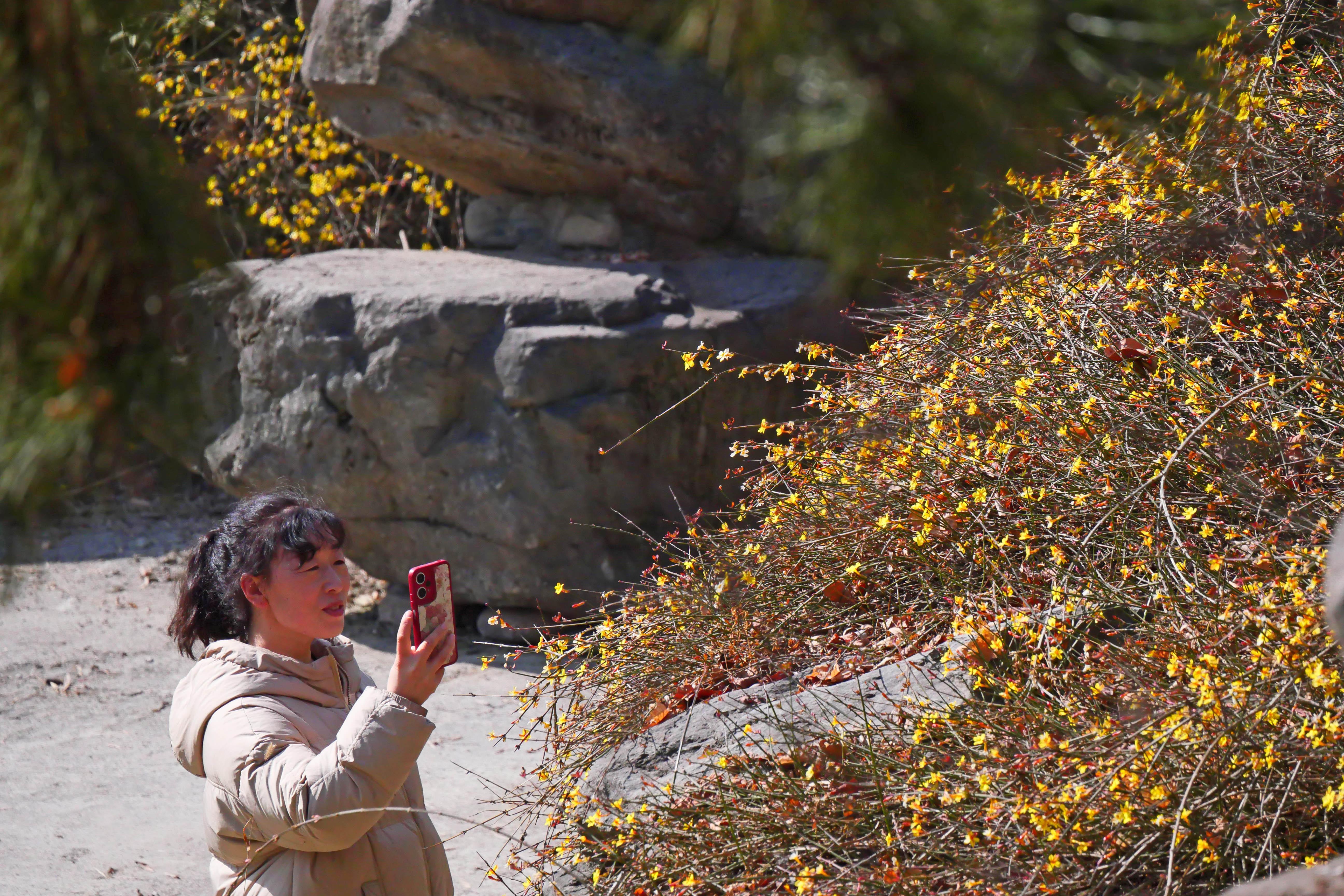 图为游人手机拍摄迎春花。