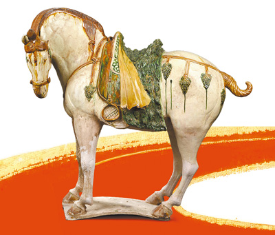 广东省深圳博物馆里,一匹唐三彩马凌空抬蹄,俯首张口,作舞蹈状。