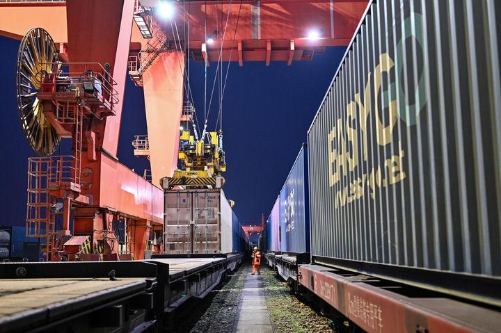 货运员在成都国际铁路港检查吊运的中欧班列集装箱(2026年2月16日摄)。新华社发(何海洋 摄)