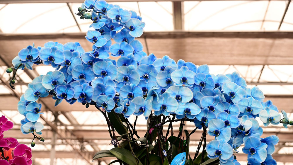 “这盆是马卡龙色的蝴蝶兰,您看这个蓝色,稀有!”摊主孙建钟捧着花瓣泛着蓝紫光泽的蝴蝶兰,向顾客热情展示。
