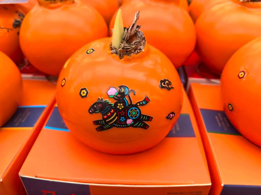 不远处,朱顶红摊位前同样热闹。摊主周超拿起一个贴着陕西非遗剪纸图案的朱顶红蜡球:“朱顶红谐音‘注定红’,配上剪纸图案,这款今年卖得最好。”