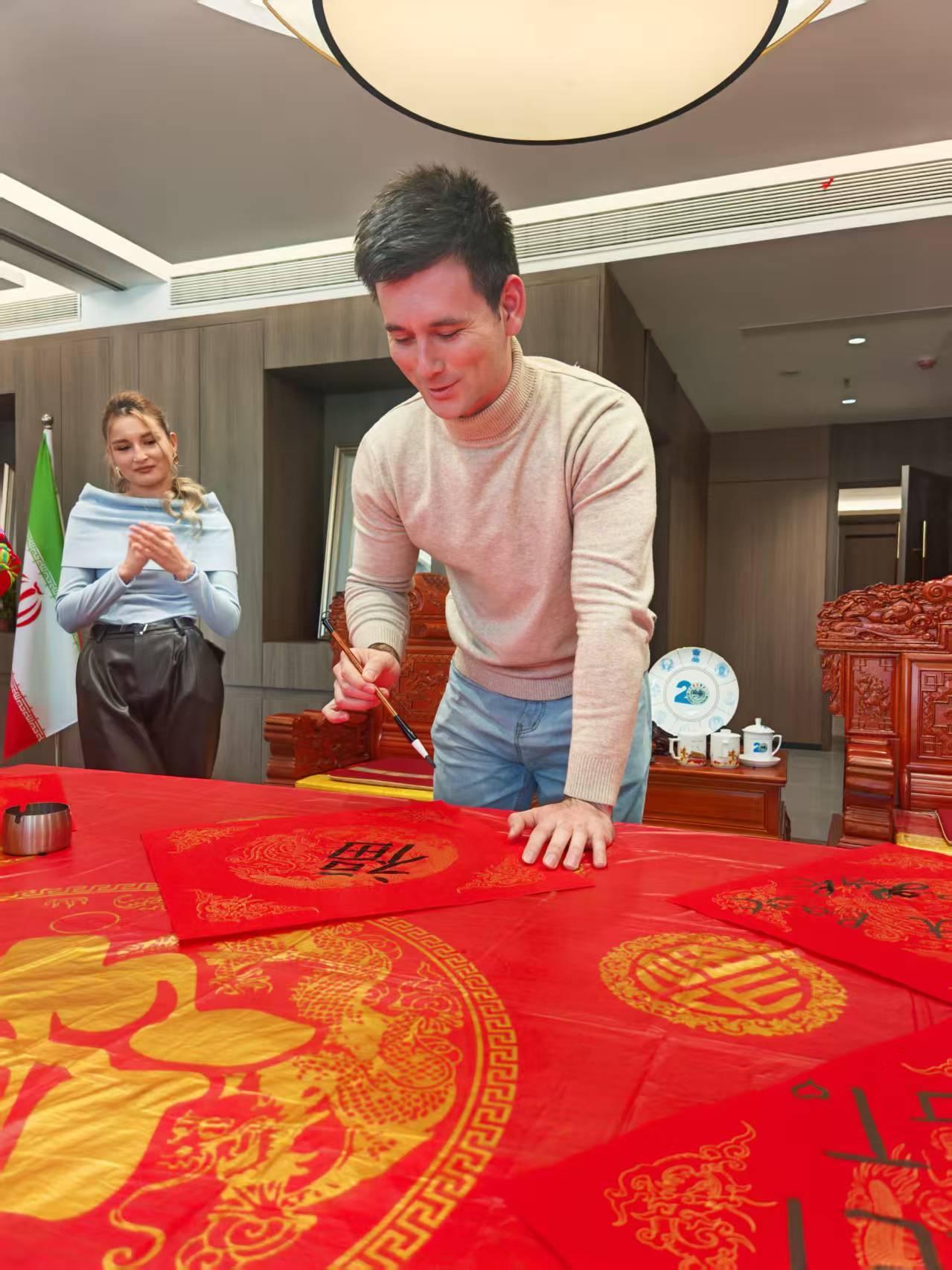 除夕下午,中心的多功能厅被装点得年味十足。红纸铺满长桌,书法老师和民俗艺人手把手教留学生们写福字、写春联、剪窗花。一位乌兹别克斯坦留学生握着毛笔,手指微微颤抖,在老师的指导下,一笔一划写下一个“福”字。当完整的字呈现在眼前时,他端详了许久,露出孩子般的笑容。旁边几位女生正小心翼翼地展开手中的窗花,随着剪刀的转动,一张张红纸在她们手中变成了寓意吉祥的图案。